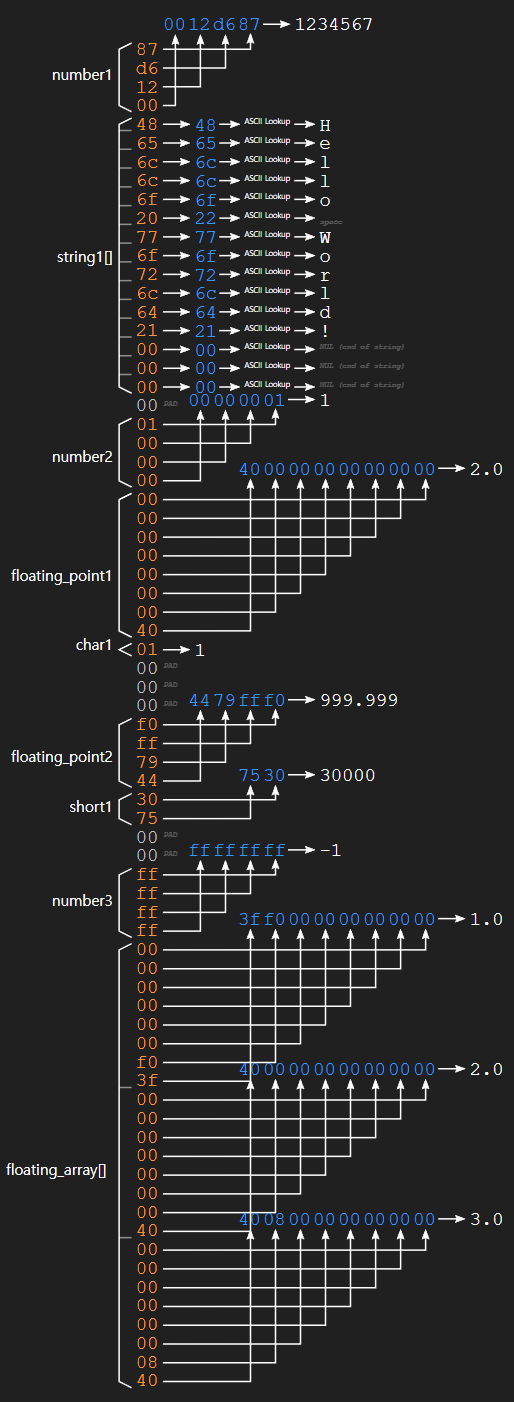 struct mydata{int number1;char string1[15];int number2;double floating_point1;char char1;float floating_point2;short short1;int number3;double floating_array[3];} d;d.number1 = 1234567;strcpy(d.string1, "Hello world!");d.number2 = 1;d.floating_point1 = 2.0;d.char1 = 1;d.floating_point2 = 999.999;d.short1 = 30000;d.number3 = -1;d.floating_array[0] = 1.0;d.floating_array[1] = 2.0;d.floating_array[2] = 3.0;